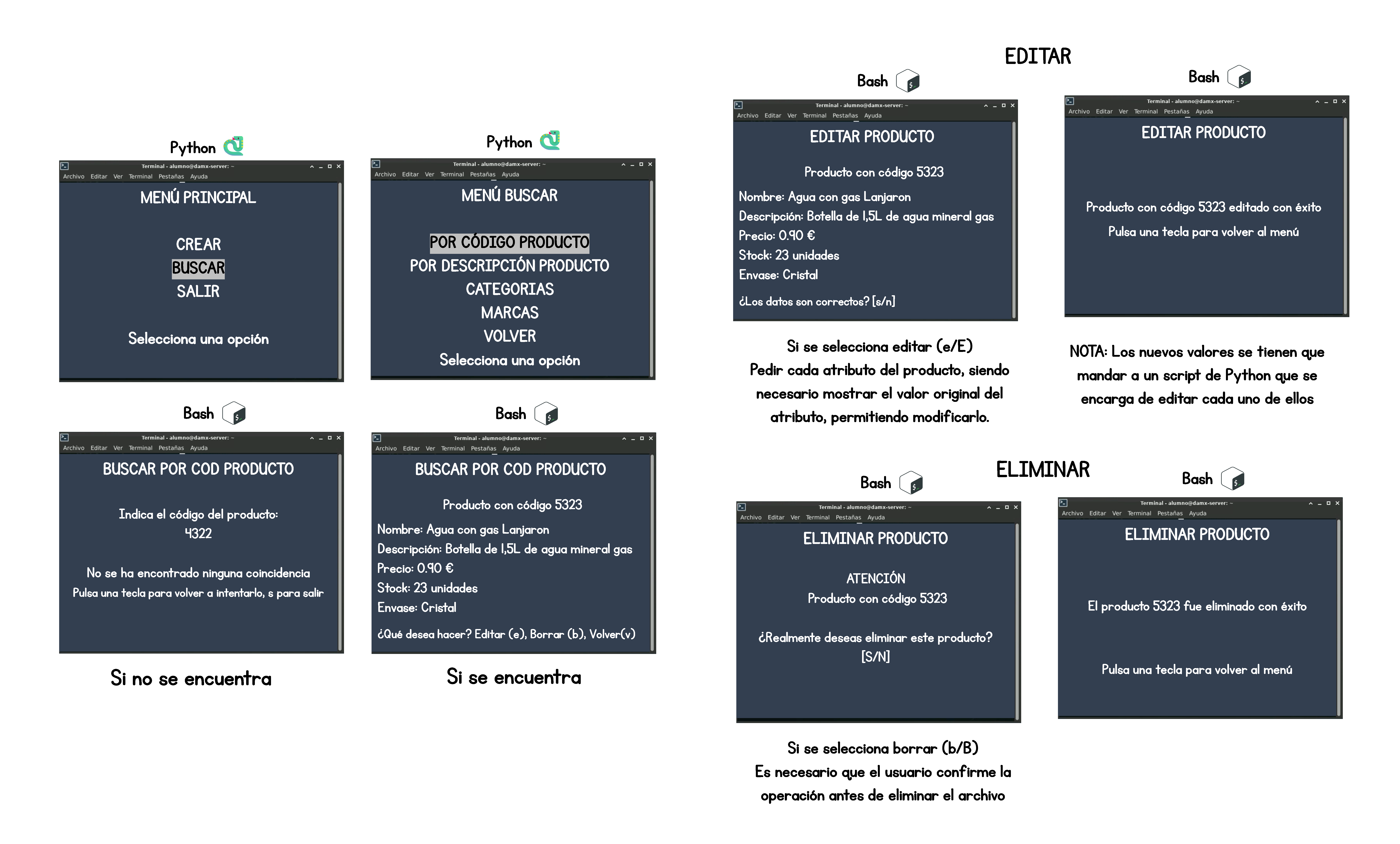 - Bash muestra el contenido del JSON y pasa los datos como argumentos a un scrip de python que se encarga de editarlo.